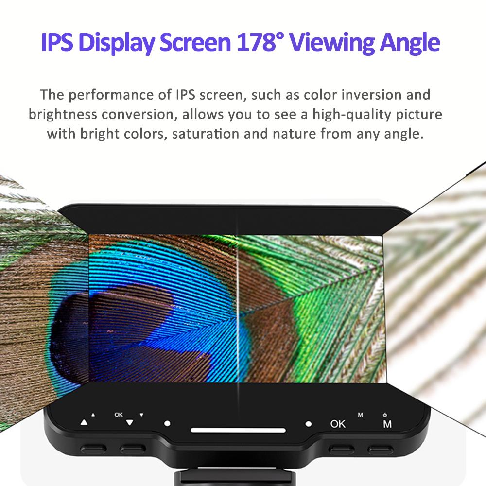 Microscopul digital este echipat cu un ecran de afisare de inalta definitie IPS de 4.3 inchi si o baterie incorporata de litiu de 3,7V 1800mAh. Puteti utiliza pe scara larga acest dispozitiv pentru examinarea bijuteriilor, plantelor, insectelor, monedelor, stampilelor, antichitatii, placilor de circuite si asa mai departe.