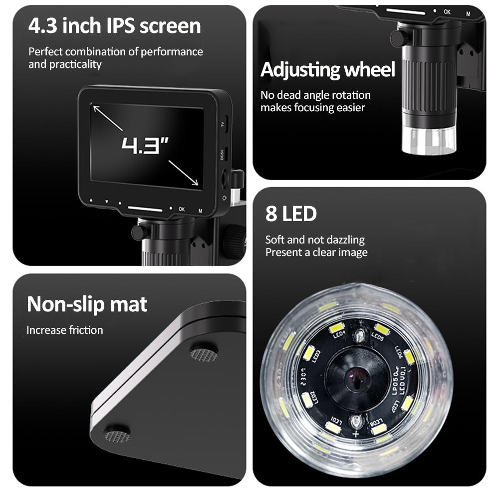 Microscopul digital are niveluri de marire de la 500x la 1000x, care sunt standard la microscoapele de cea mai buna calitate, permitand vizualizarea cu precizie a celor mai mici detalii ale specimenelor. Focalizarea fina si grosiera de precizie aduce specimenul in atentie rapid si clar, oferindu-va „o experienta minunata in explorare.” Dispozitivul suporta 11-12 limbi. Ecranul IPS mare de 4.3" permite vizualizarea instantanee si afisarea imaginii de inalta calitate la o claritate extrema. Camera HiTech cu pixeli inalti, combinata cu ecranul IPS, permite capturarea imaginilor si videoclipurilor HD (pana la 25 de cadre pe secunda), care pot fi salvate pe un card TF de maximum 32 GB (nu este inclus). Microscopul suporta, de asemenea, conectarea la PC printr-un cablu USB sau afisarea prin HDMI. Este compatibil cu Windows 7, Windows 8.1, Windows 10, Mac OS X 12 sau o versiune ulterioara.