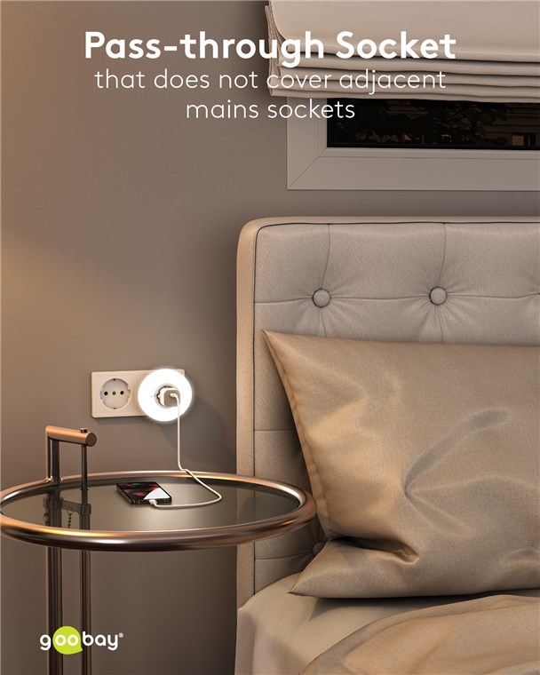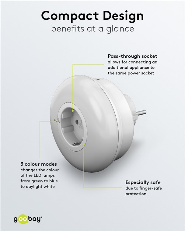 Datorita designului sau compact de 82 x 82 x 72 mm, lumina de noapte nu acopera prizele adiacente.